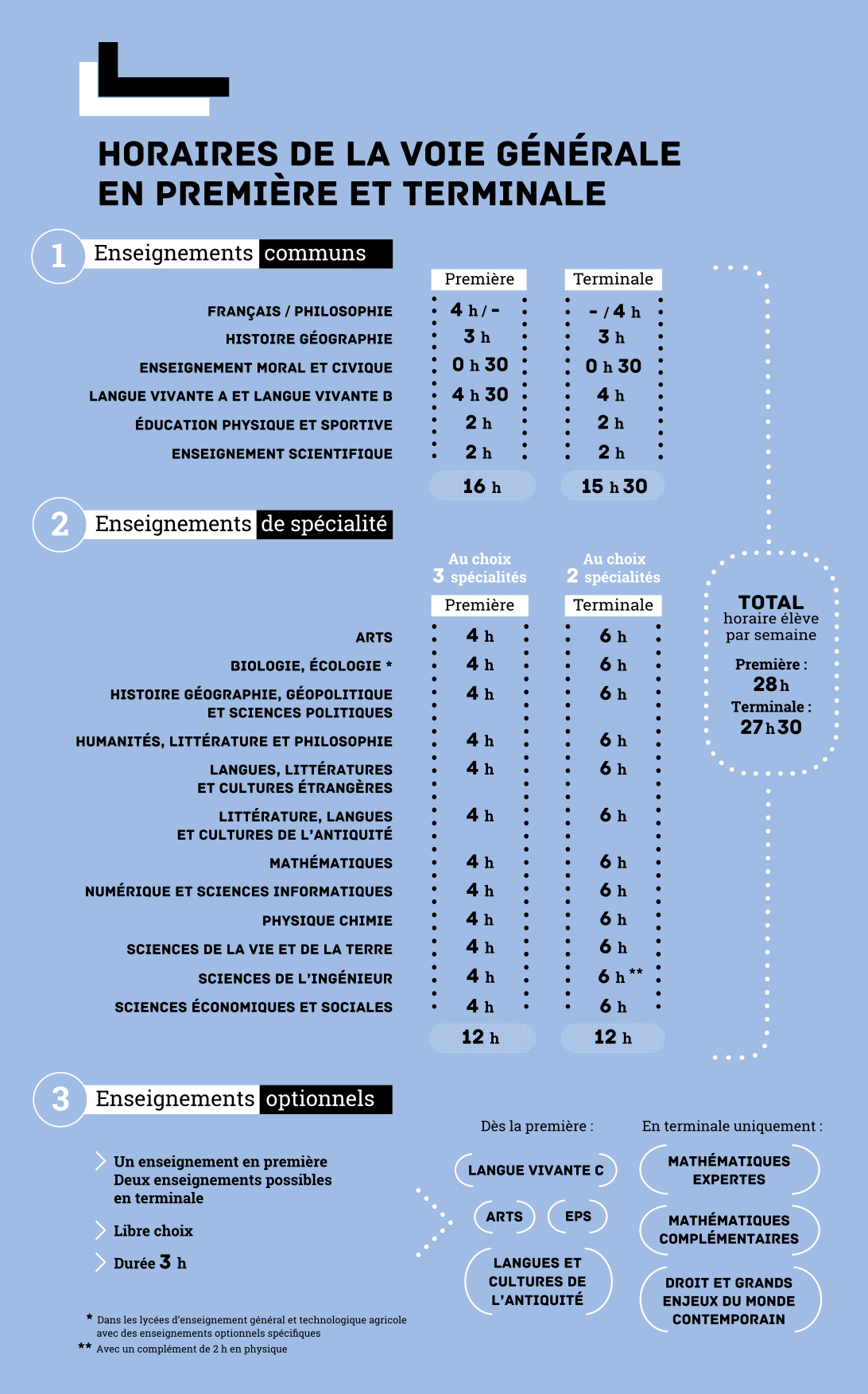 During Grade 11, each student must choose three speciality courses, each one taught for 4 hours per week. Two of these courses are kept in Grade 12, for 6 hours per week each.